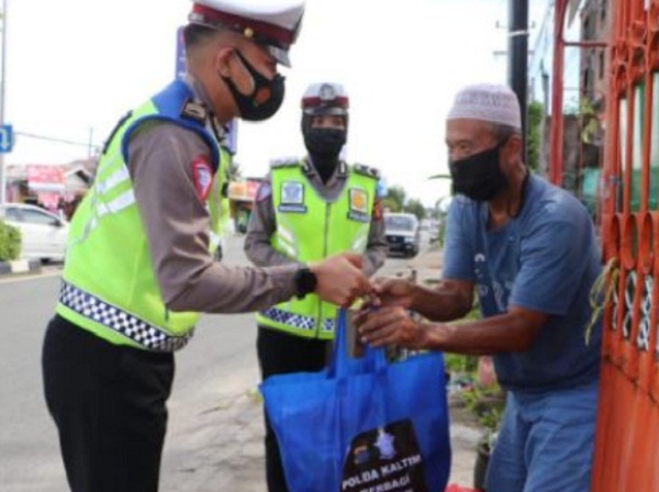 Balikpapan. Direktorat Lalu lintas Polda Kaltim memberikan himbauan serta membagikan bantuan sosial berupa sembako dan masker kepada masyarakat yang bekerja sebagai pedagang keliling dan pemulung di wilayah Kota Balikpapan.