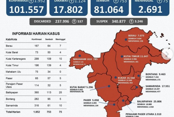 Andi menyebutkan tambahan kasus terkonfirmasi positif terjadi di Berau 167 kasus, Kutai Barat 73 kasus, Kutai Kartanegara 299 kasus, Kutai Timur 196 kasus, Mahakam Ulu 75 kasus, Paser 65 kasus, Penajam Paser Utara 114 kasus, Balikpapan 365 kasus, Bontang 282 kasus dan Samarinda 316 kasus.